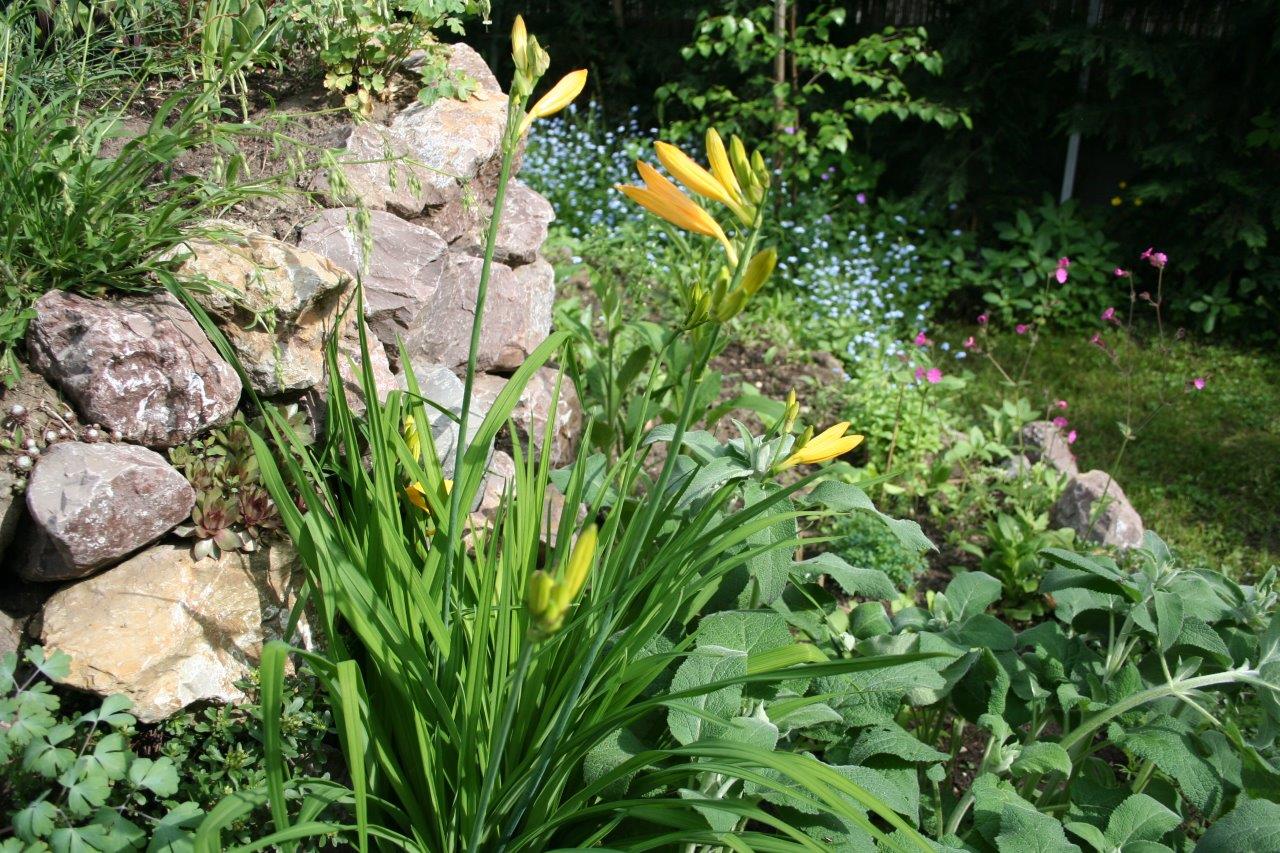 Die Tagliliensorten sind Blattschmuckstauden, sie vertragen Nässe und Dürre.