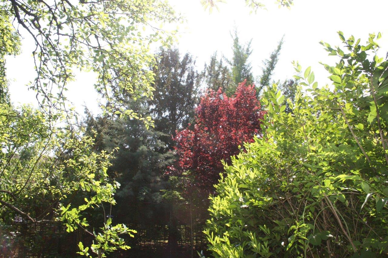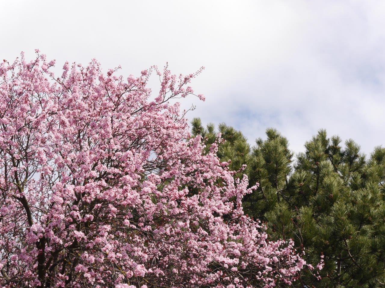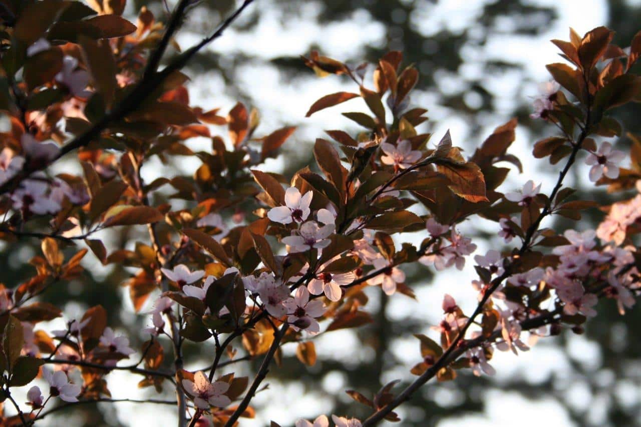 Regina Hruska „Die Blütenbracht der Kirschpflaume im Frühjahr und ihre rötlich strahlenden Blätter begrüßen Teilnehmer der Seminare und Menschen, die im Schamanenzentrum Wien, Termine und schamanische Beratung in Anspruch nehmen“.