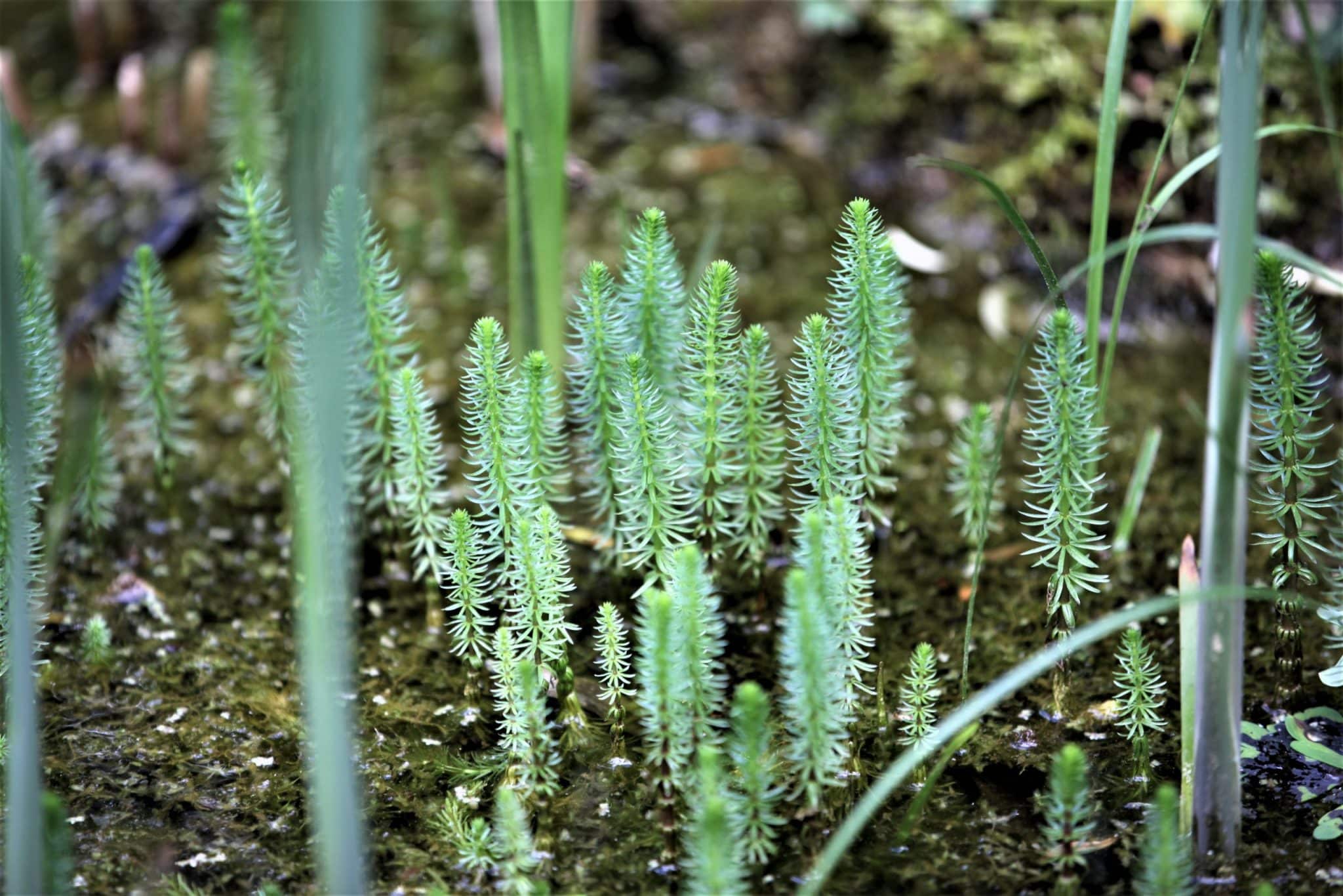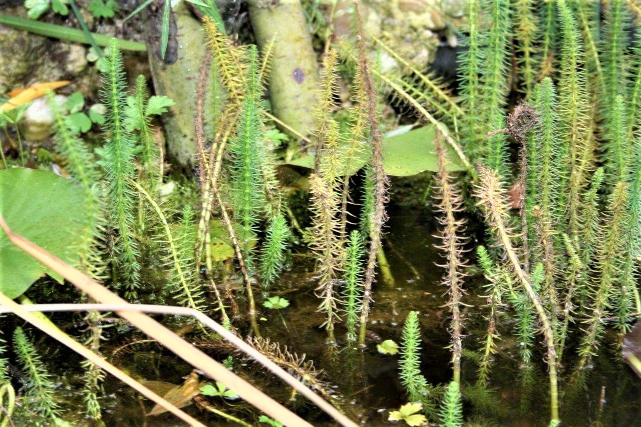 Der Tannenwedel wächst im kleinen Teich, der vor der Kräuterspirale im Heilgarten